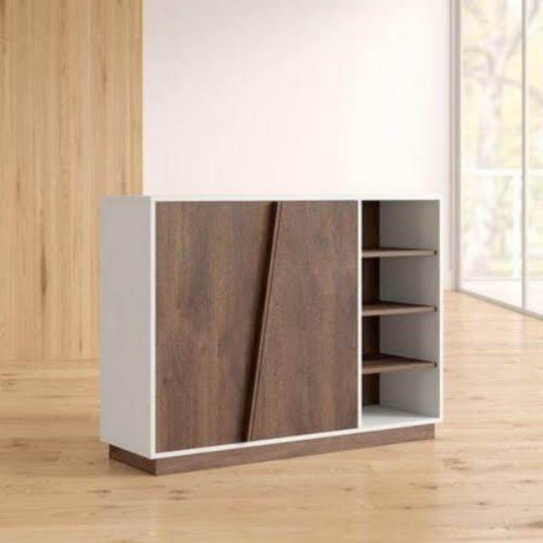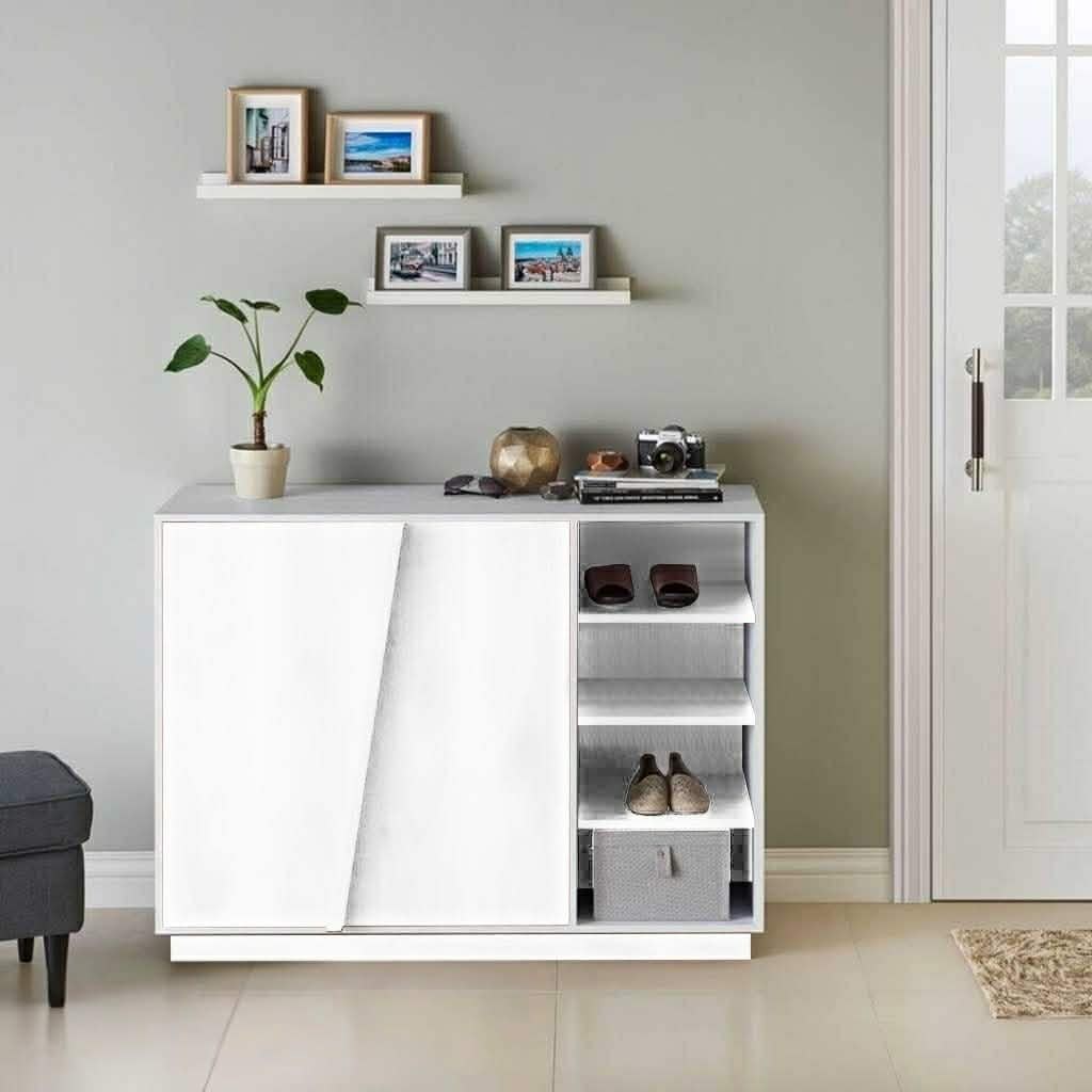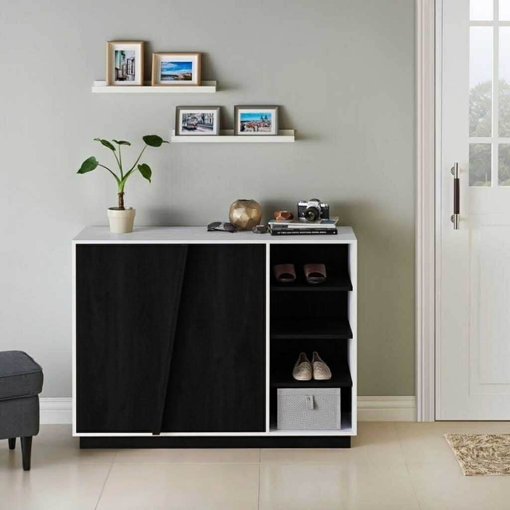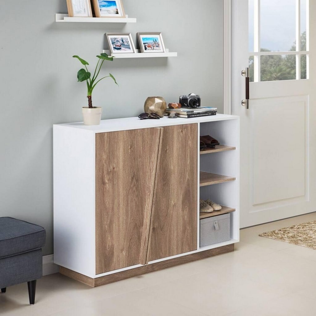 Features one storage door alongside 3 open side shelves for easy shoe organization.